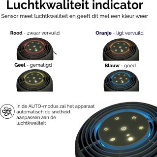 - Automatische luchtkwaliteitsmonitor: het verlichte bovenpaneel geeft in één oogopslag de luchtkwaliteit aan — blauw (goed), groen (redelijk), oranje (slecht) en rood (zeer slecht).
