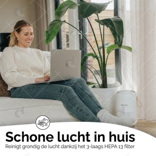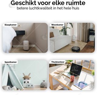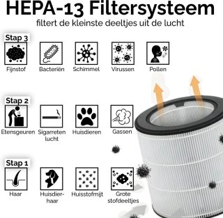 - Geavanceerd 3-laags filtersysteem: voorfilter + HEPA13 + actief koolstoffilter. Samen verwijderen ze stof en allergenen, filteren ze microdeeltjes (ook microplastics, bacteriën en virussen) en neutraliseren ze geuren en rook.
